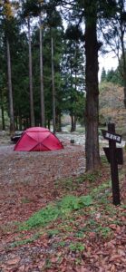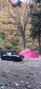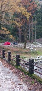 オープンに先立ち、紅葉が堪能できる11月8日、1組のキャンパーの方にモニターをお願いした様子です。