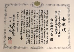 去る12月8日、白山市役所に於いて令和7年度「国土計画協会会長賞」の表彰式があり、田村白山市長のご出席のもと、一般財団法人国土計画協会より表彰状をいただきました。